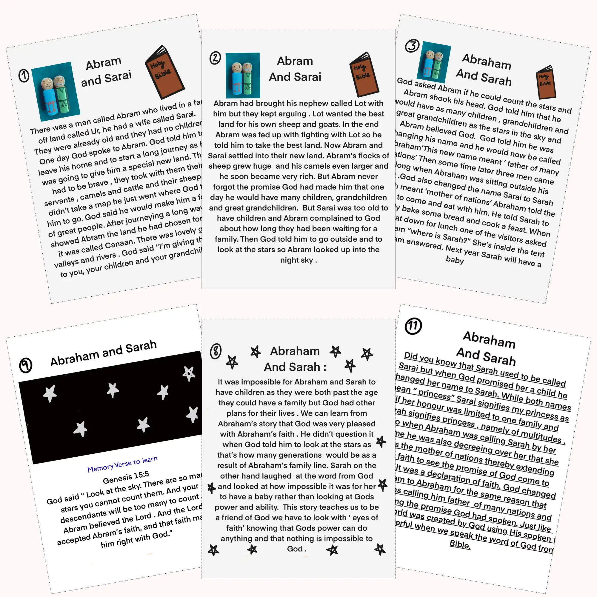 A unique and creative way for children to learn the bible heroes of faith and build up a beautiful set to take them on a month by month journey through the bible , captivating their interest and their hearts for the things of God and bible truths. Having the physical peg dolls helps to add a dimension of play to learning the stories while bringing them to life.