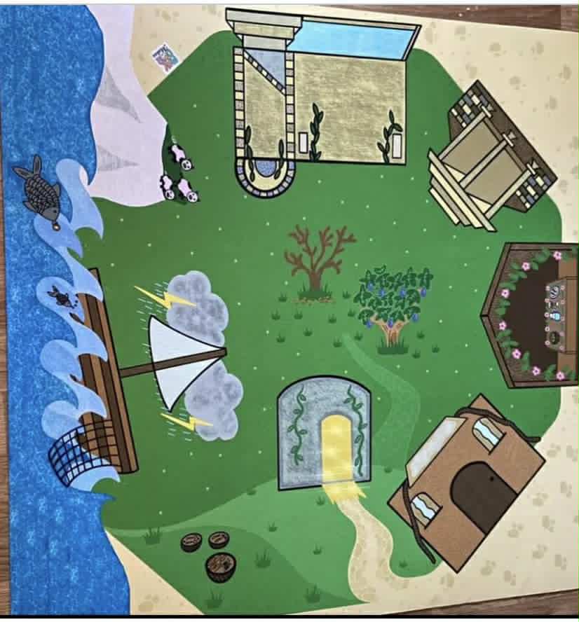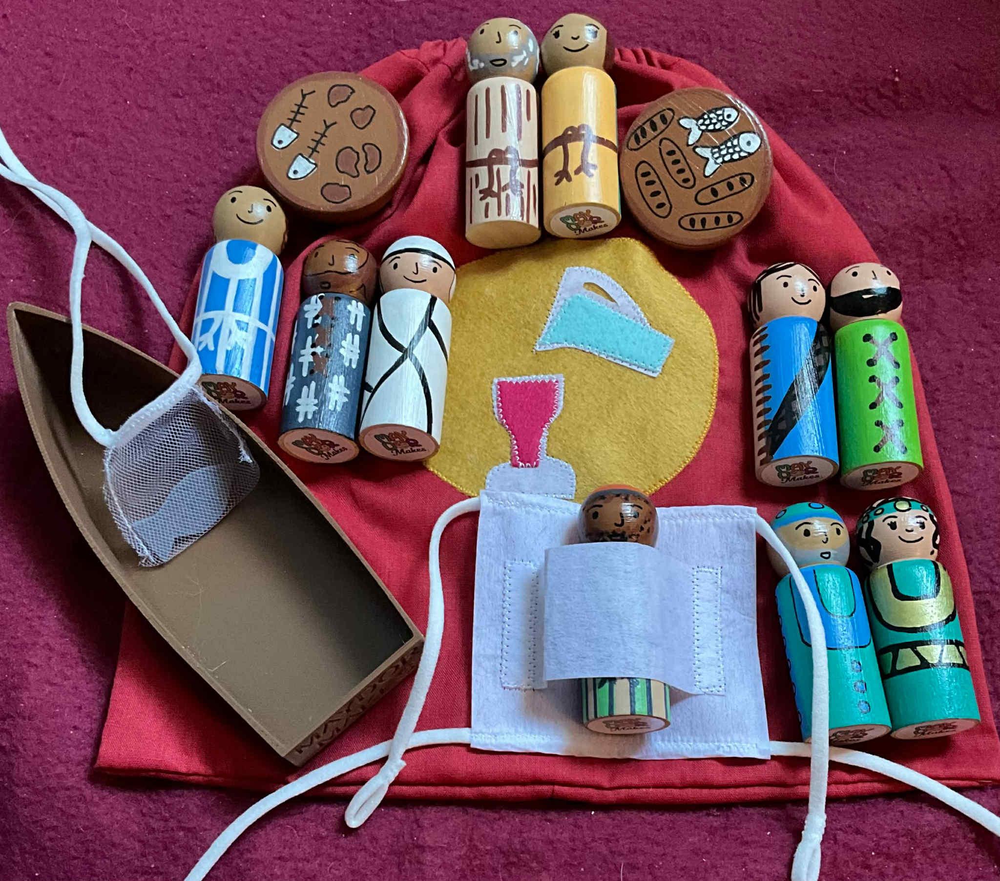 Miracles of Jesus felt carpet playmat set comes with beautiful wooden accessories to go with the mat featuring the miracles of Jesus , finished in toy safe varnish and come in a themed handmade bag. Miracles featured are pool of Bethsada, water into wine at the wedding, calming the storm,/Jesus walking on water, feeding the 5000, healing at the temple, paralytic friend lowered through the roof, withering of the fig tree, evil spirits into the pigs off the cliff , Lazarus tomb-raising from the dead. Beautifully drawn by us and turned into a powerful tool to teach children the miracles of Jesus