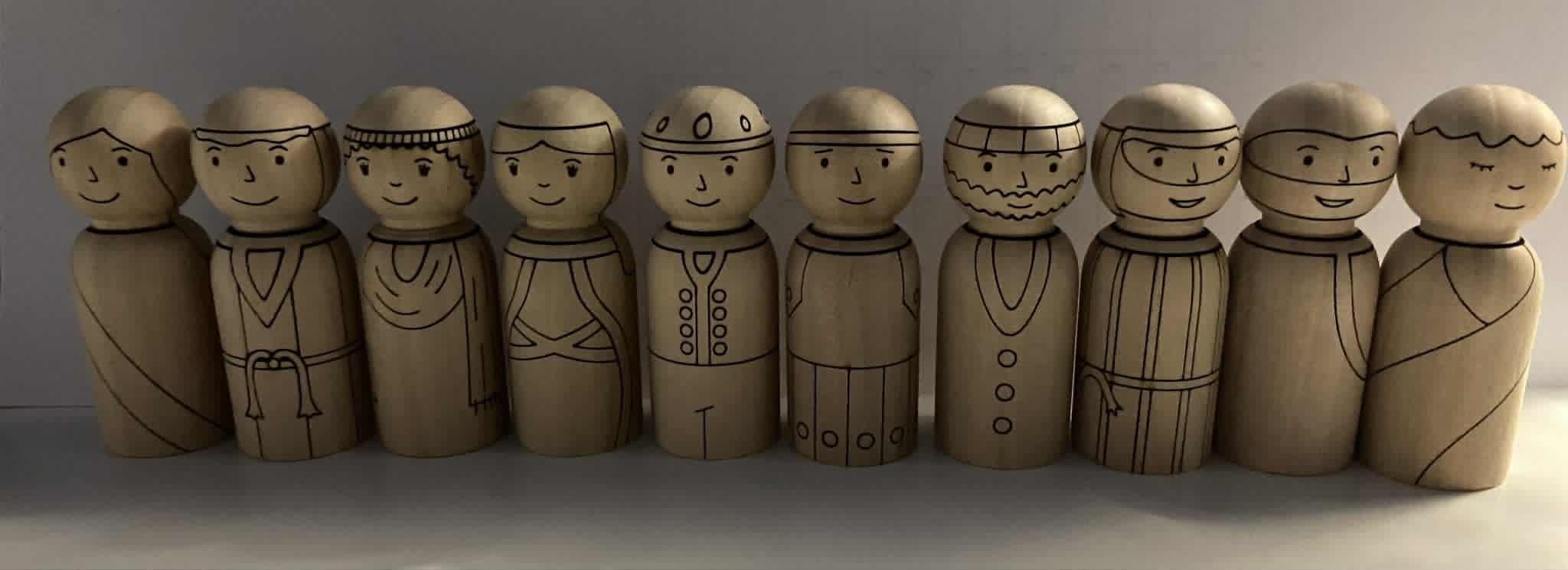 Beautiful large playmat at 39” (99cm) printed onto vinyl featuring scenes from the Bible and scenery where many Bible stories can be told. Comes with a beautiful set of 10 peg dolls (9cm) beautifully laser engraved designs to bring the bible stories to life for children. It’s amazing to see children learn the Bible through play in a way they understand and see it brought to life before their eyes. These sets have been so popular and we are so excited to bring them to the USA . They can be rolled up and stored when not in use. A great way to get all involved whether that be as a family or at a church. This is one of 4 designs currently but we are always creating more so please check out all our sets.