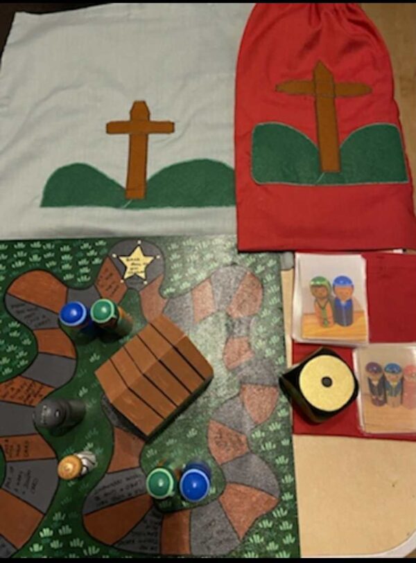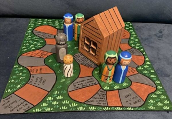 Utterly beautiful board game created and designed by us , take Mary and Joseph on the journey to Bethlehem to the stable to have baby Jesus. Use the spaces and different cards along the way to race your opposition to be the first to the stable. Stunning detail and a lovely unique gift. All finished in toy safe varnish and comes with wooden stable and bible peg dolls and dice and game cards, comes in a nativity themed handmade bag .